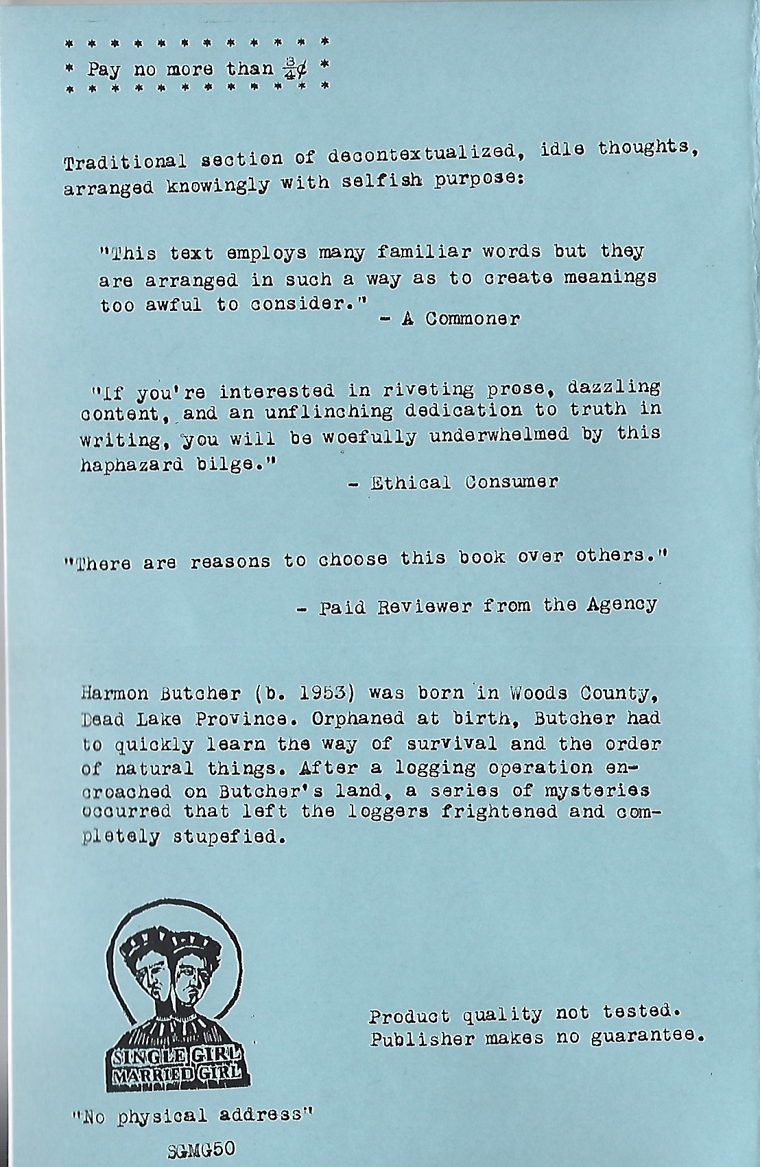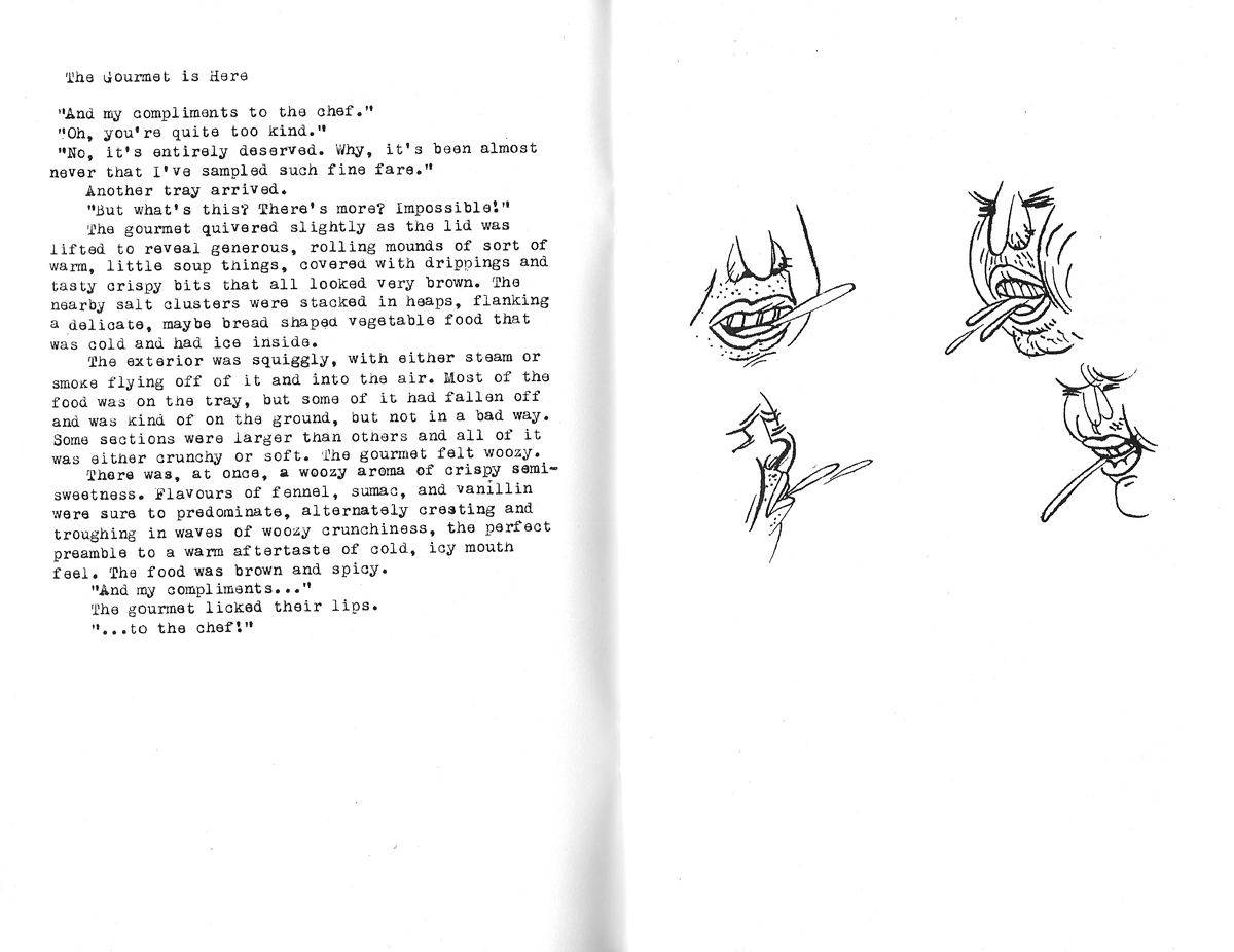 If not the finest, then at least the newest volume of Butcher’s patently haphazard yet undeniable prose. However, this is not merely a book of words. Consumers are emphatically encouraged to purchase this modest volume for their own good*, for it contains both the fantastic drawings of the inimitable Lale Westvind and the aforementioned the words-in-a-row, strung together by Butcher.